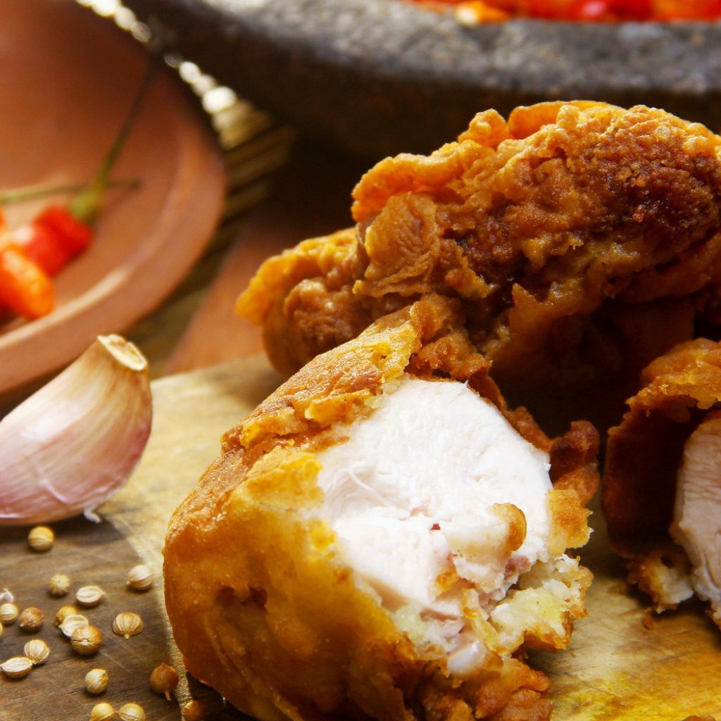4. Siapkan ayam utuh, pisahkan daging ayam dengan tulangnya, simpan tulang untuk membuat kaldu ayam. Berikan perasan jeruk lemon, garam dan lada pada daging ayam.