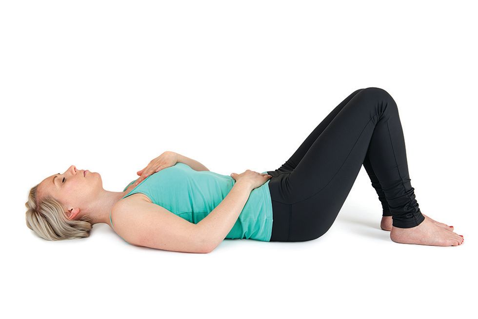 Gerakan ini juga diawali dengan posisi berbaring dengan meletakkan satu bantal di atas lutut dan satu lainnya di bawah kepala. Tutup mata dan ambil napas panjang secara perlahan melalui hidung. Anda harus bisa merasakan seluruh dinding dada mengembang hingga bagian diafragma atau tulang rusuk terbawah.