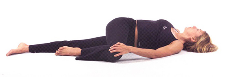 Pada gerakan ini, Anda mulai dengan posisi berbaring dengan kaki terentang dan posisi lengan di samping tubuh. Anda bisa meletakkan bantal di bawah kepala bila perlu. Kemudian angkat dan pelut lutut kiri ke arah dada dan tarik napas.