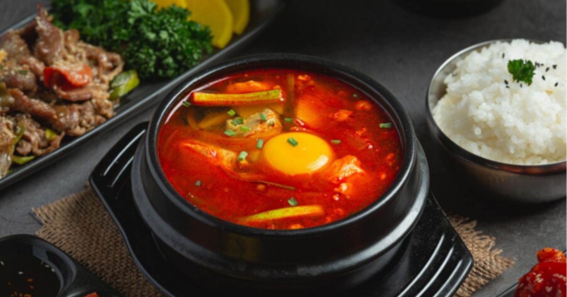 Sundubu jjigae dikenal dengan kuah merah pedas yang dibuat dari gochugaru (bubuk cabai Korea) dan gochujang (pasta cabai Korea), memberikan rasa pedas dan warna merah yang khas.