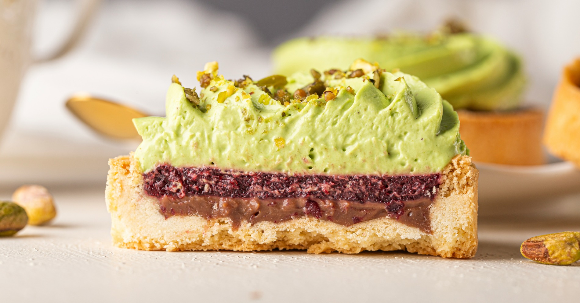 - Semportkan adonan pistachio, kemudian cokelat ganache di bagian paling atas;