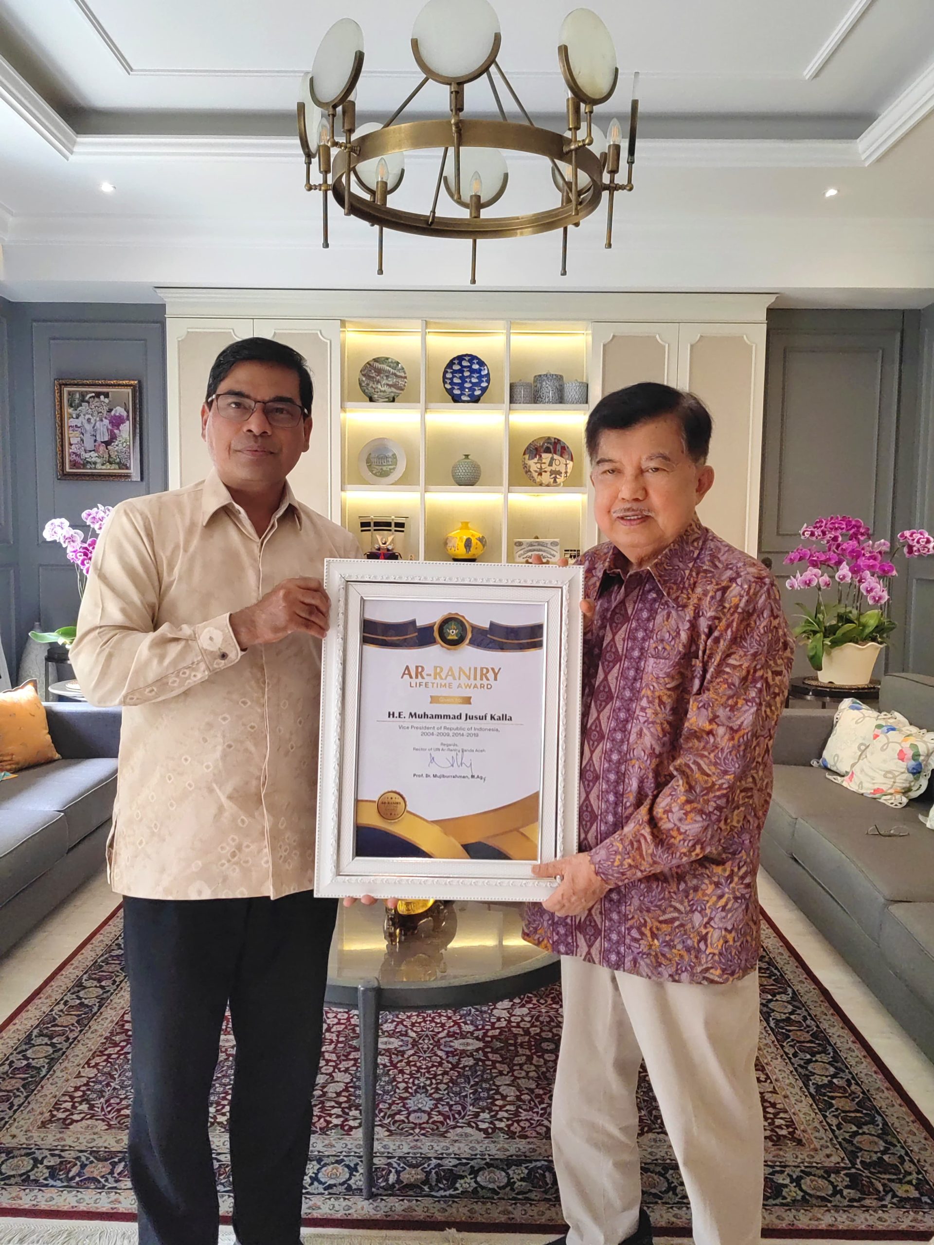 WARTANA, JAKARTA — Universitas Islam Negeri (UIN) Ar Raniry Banda Aceh, Provinsi Aceh resmi menyerahkan Piagam Penghargaan Ar Raniry Award kepada Wakil Presiden RI ke 10 dan 12 Jusuf Kalla alias JK. Penyerahan penghargaan ini dilakukan Rektor UIN Ar Raniry Prof. Mujiburrahman di kediaman JK, Jalan Brawijaya Raya, Jakarta Selatan, Senin, 18 Agustus 2025.