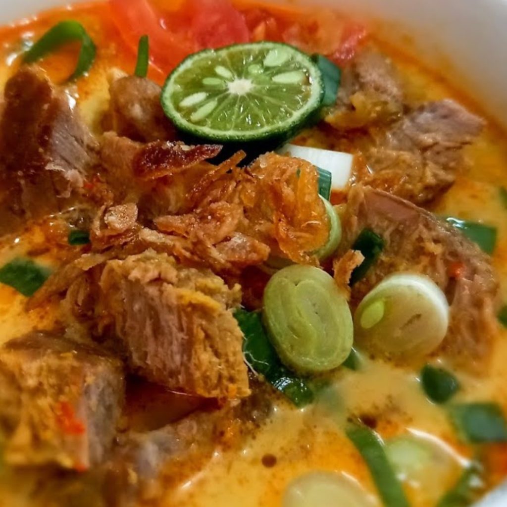 Soto khas Betawi dengan iga sapi dan kuah santan gurih. Makin nikmat disajikan dengan emping dan nasi hangat.